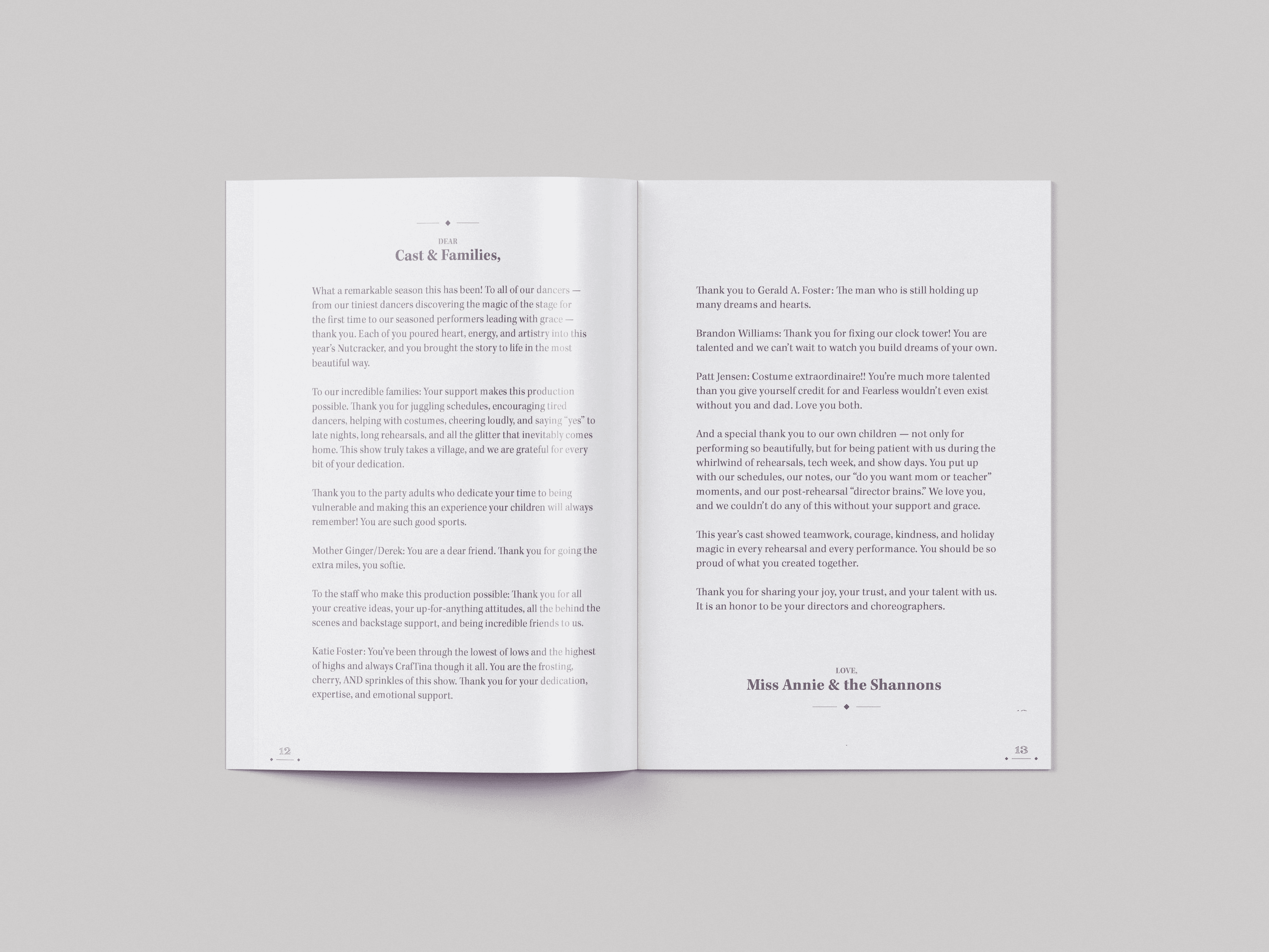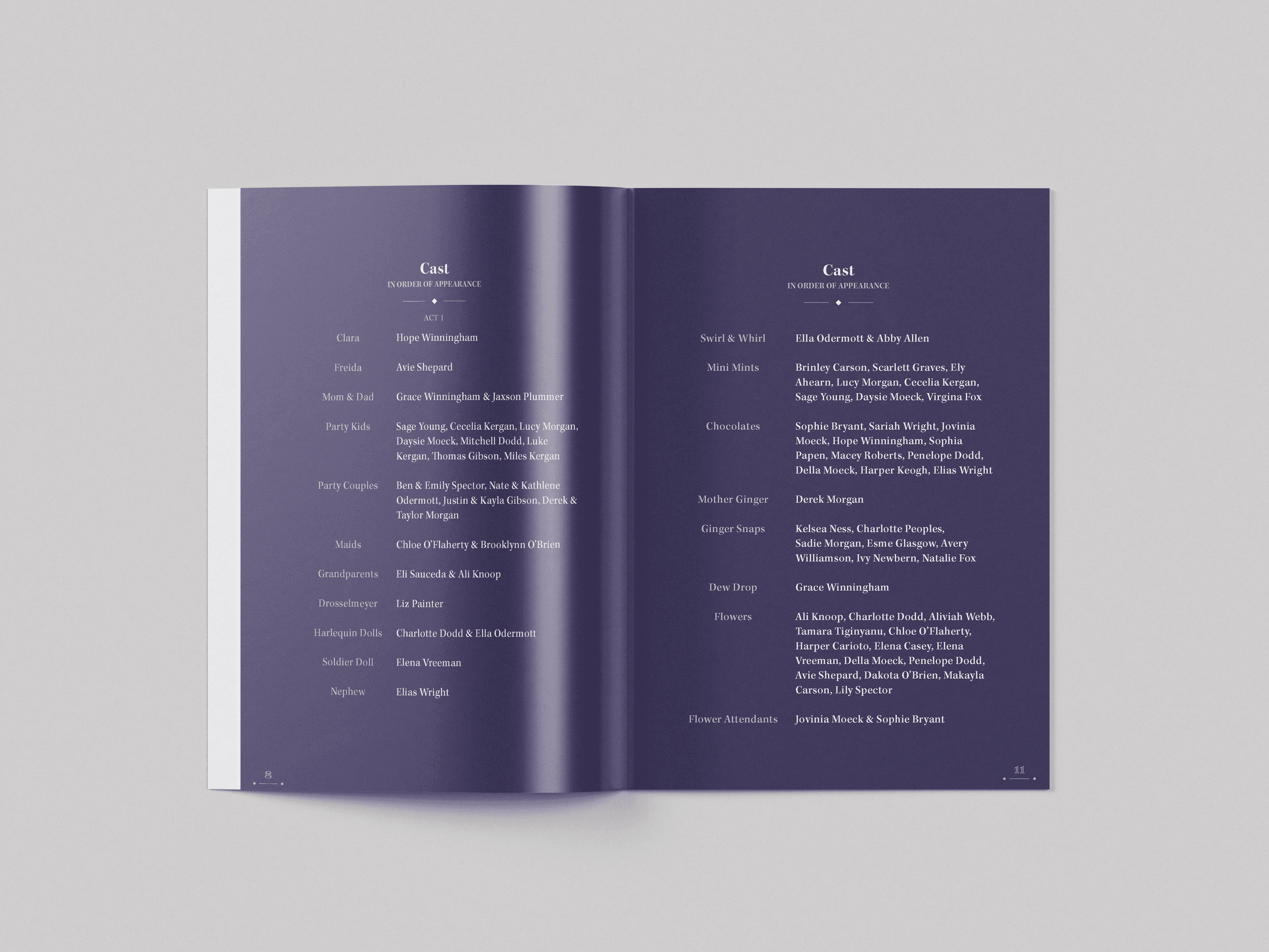 For both the yearbook and show programs, I developed layouts that reflect the energy and movement of dance through rhythmic visual patterns, inviting typography, and structured grids. I selected palettes and type pairings that felt vibrant but considerate of legibility, which was especially important for performance orders, student lists, and candid photography.